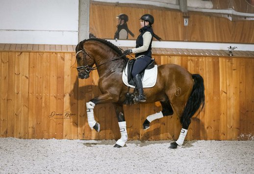 Ein reines Vergnügen in jeder Hinsicht - mit atemberaubendem Aussehen und dem barocken Typ treu, ist er ein freundlicher und mitfühlender Junge, der sicherlich versuchen wird, seinem neuen Besitzer zu gefallen. Mit drei korrekten und bequemen Gangarten ist er leicht zu sitzen und unkompliziert zu fahren. Ruhig und mit einer super Einstellung ist er ein großzügiges Pferd, das es gewohnt ist, von weniger erfahrenen Reitern und sogar Kindern geritten zu werden – ein großartiges Familienpferd. Mit einem freundlichen und sympathischen Charakter ist er leicht in allen Handhabungsaktivitäten und angenehm in der Nähe. Derzeit führt er seitliche Bewegungen aus und wird in die Arbeit mit fliegenden Veränderungen eingeführt.