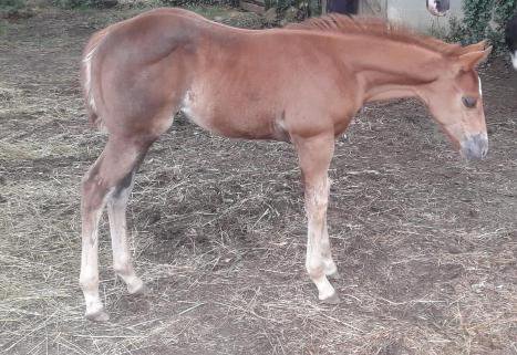 JoleneSpooksAtDusk ist eine kompakte Quarter Horse Jährlingsstute, 6.2021 geboren und einem geschätzten Endmaß von 146-148 cm. Sie ist ein gut bemuskelter Jährling mit einem etwas schüchternen Charakter, guten Bewegungen und einer tollen Reining/Cutting Abstammung. Sie ist 92,75 % Fundation gezogen. Jolene wächst artgerecht im Herdenverband mit Gleichaltrigen in Robusthaltung auf, kennt das Fohlen ABC und ist 5-Panel n/n über die Eltern. Ihr Vater ist der erfolgreich geshowte Undercover Spook, ein Smart Spook Sohn aus einer Custom Crome Tochter. Jolenes Mutter stammt von Marthas Mega Jac ab. Sie zeigt Cowsense und ein großes Talent für Stopp und Spin. Tolles Nachwuchspferd für den Reining/Cutting Bereich.