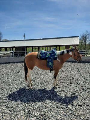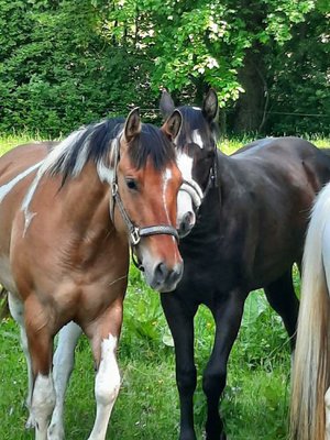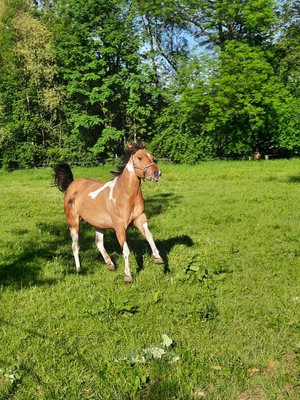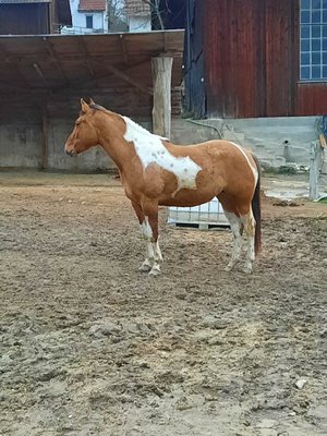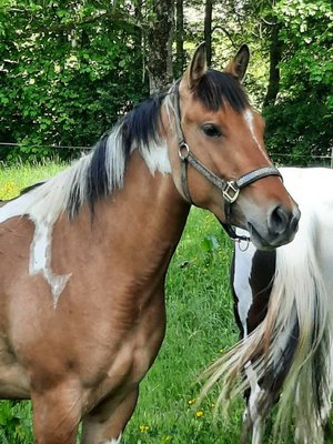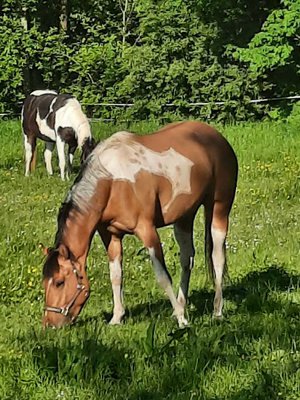 Schweren Herzens sucht diese bildhübsche, kräftige Paint Horse Stute ein liebevolles, neues Zuhause. Die 2018 geborene Stute hat einen kräftigen, kompakten Körperbau und deckt mit ihrer Größe von 153 cm auch größere Reiter gut ab. Sie ist brav im Umgang und beim Führen, hat aber schon einen "Stutentypischen Charakter“ . Derzeit befindet sie sich in der Grundausbildung beim Profi und geht unterm Sattel die Gundgangarten. Sie ist bei der Arbeit sehr lernwillig und kooperativ und zeigt sich unterm Reiter brav und anständig. Leider hat sie in der Offenstallhaltung ein leichtes Ekzem entwickelt und wird daher nur in Paddockbox mit Auslauf/Koppel abgegeben. Als Fohlen hatte sie einen Nabelbruch, der aber laut mehreren Tierärzten sehr gut verheilt ist. Aufgrund dieser 2 Dinge wird Katy nicht als Zuchtstute verkauft. Sie wäre mit Sicherheit ein guter Freizeitpartner, gerne auch an Reiter mit Turnierambitionen für die ganzen Ranchklassen/Reining oder den Trail. Im Auftrag der Züchterin zu verkaufen.