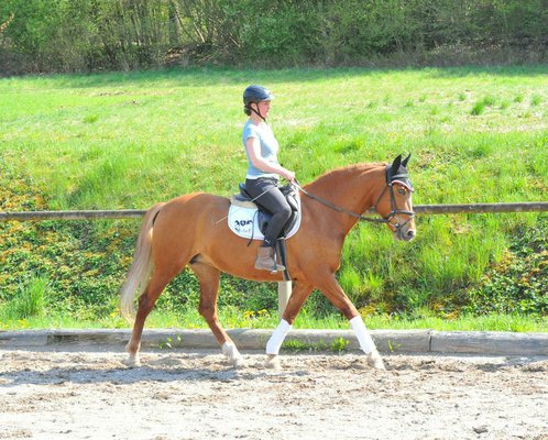 Sehr hübsche, sympathische Fuchsstute mit tollem Charakter und guten Nerven. Einfach durchs Genick, anhänglich und verschmust. Mit angenehmem Sitzkomfort ausgestattet. Eine tolle Stute für den vielseitigen Allrounder. Geeignet für Dressur, Springen, Freizeit, Halle, Platz und Gelände.