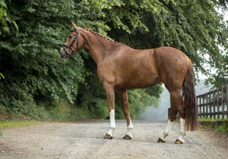 Fuchsstute Diva Royal von dem Prämienhengst Donquestador (Donnerhall x Romadour II-Grünfink-Jonkheerxx) aus der Staatsprämienstute Clarissa von Royal Hit (Rohdiamant-Rubinstein) x Classiker (Cor de la Bryere)-Perser xx. Die Mutter Clarissa ist eine Oldenburger Staatsprämienstute mit excellenter Stutenleistungsprüfung (Galopp 9, Trab 9, Schritt 8). Diva Royal ist eine sehr korrekte und ausdrucksstarke Stute mit ganz viel Stutencharme und mit überzeugender Bewegungsdynamik. Sie ist eine großramige Fuchsstute mit gutem Fundament, sehr guten Grundgangarten und Rittigkeit. Sie hat mehrere Platzierungen in M Dressur , erste S Lektionen im Ansatz vorhanden,gute Stutenleistungsprüfung abgelegt. Die Stute zeigt ein gutes Versammlungsvermögen für Piaffe, Pirouette und Passage(Im Ansatz vorhanden) neben der Dressur macht sie aber auch einen guten Sprung.Diva Royal ist ein absolutes Verlaßpferd, auch im Gelände. Sehr menschenbezogen. Potential nach oben offen. Ist von jedermann leicht nachzureiten. Das Pedigree vereinigt die Dressurgrößen Donnerhall, Romadour II und Rubinstein mit der Springlegende Cor de la Bryere. Diva Royal ist Halbschwester zur Staatsprämienstute Fürstin Romancier (Fohlengold und 3jährig Goldmedaille des Landes NRW.3 jährig Reservesiegerin Bucha und 4 jährig Bronze Rheinische Meisterschaften)und Vollschwester zu unserem Wallach Don Rubin, der bis zur schweren Klasse ausgebildet ist und zahlreiche Platzierungen vorweist. Stockmaß 176. Geb. 08.05.2013. RöntgenAKU I-II. Ausbildungsstand M-Dressur. Kann erste S Lektionen. 2x2. Platz in M Dressur.