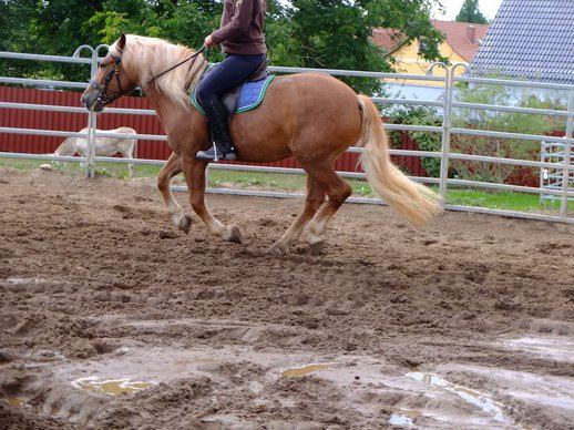 Sie ist geritten in allen Gangarten auf dem Platz und geht problemlos im Gelände allein oder in der Gruppe.