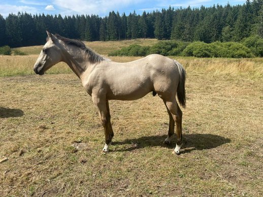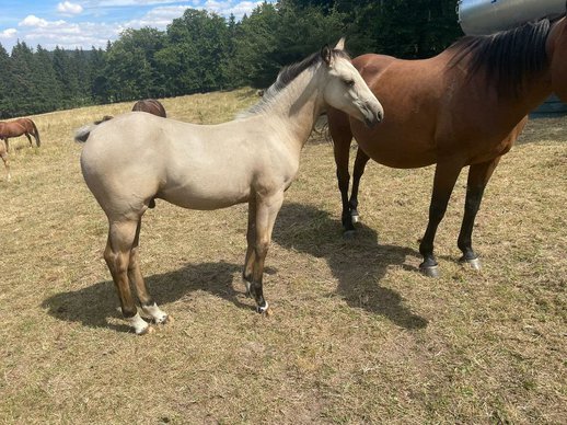 Dieser niedliche, gut gebaute Quarter Horse Hengstabsetzer sucht nach dem Absetzen ein tolles, neues Zuhause. Er ist 4.2022 geboren und wird ein geschätztes Endmaß von 147 cm bekommen. Ausgestattet mit einer tollen Farbe (buckskin), einem ganz lieben, aufgeschlossenen Charakter und vielversprechende Proportionen verzaubert dieser junge Mann seine Umwelt. Bacardi wächst artgerecht unter allerbesten Bedingungen auf und kennt bei Abgabe alles, was ein Fohlen kennen und können sollte. 5-Panel n/n über die Eltern. Der Vater von Bacardi ist White Mobster, ein HF Mobster Sohn aus einer Lil Ruf Peppy Tochter. Die Mutter vom Fohlen ist eine The Sharp Shooter Tochter. Mehrere Nachzuchten von ihr laufen erfolgreich im Sport und sind alle leistungsbereite, rittige, leicht händelbare Pferde. Er wird bestimmt ein toller Partner sowohl für die Freizeitgestaltung als auch den Sporteinsatz.