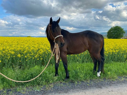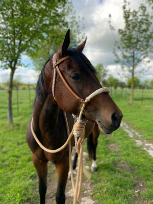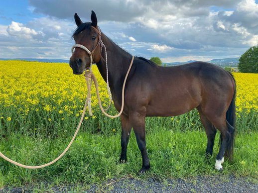 Wegen Aufgabe des Reitsports sucht diese bildhübsche Quarter Horse Stute ein liebevolles 5 Sterne Zuhause. Ella ist 2018 geboren und wird ein Endmaß von ca. 155–160 cm bekommen. Die Stute ist ausgewogen bemuskelt. Da sie noch jung ist, wird sie noch kräftiger werden. Ella ist unter allerbesten Bedingungen aufgewachsen und es wurde viel Wert auf gute Mineralstoffe, Fütterung und Haltung gelegt. Die Stute ist sehr sozial und kennt Offenstall- sowie Boxenhaltung. Gesund und fit. 5-Panel n/n. Schmiede- und verladefromm. Unverbraucht und schonend angeritten. Ella besitzt eine solide Westernausbildung, ist vielseitig ausgebildet worden. Kennt die Arbeit am Rind und Stangenarbeit. Geht zuverlässig ins Gelände und hat auch schon viele Kurse besucht. Sie wurde viel vom Boden aus gearbeitet, ist total gelassen bei Flatterplane, Pylonen, Lasso usw. Sie sollte regelmäßig geritten werden, da sie bei Unterforderung auch schon mal kurz den Hintern lupfen kann. Bei der Arbeit zeigt sie sich sehr gelassen, aufgeschlossen Neues zu lernen und äußerst lernwillig. Den Umgang mit Kleinkindern, Treckern, Hunde usw. ist sie gewöhnt. Auch ihre Abstammung ist sehr gut. Ihr Vater ist der gekörte und erfolgreich geshowte Quarter Horse Hengst Aint It Copperchoc, ein Aint It The Blues Sohn. Ellas Mutter ist eine Sheiks Silent Tochter. Also bestes Allroundblut, daher vielleicht auch interessant für die Zucht. Ella verspricht ein tolles Pferd für die Allround/Rinderklassen zu werden. Aber auch ein zuverlässiger Begleiter für die Freizeit.