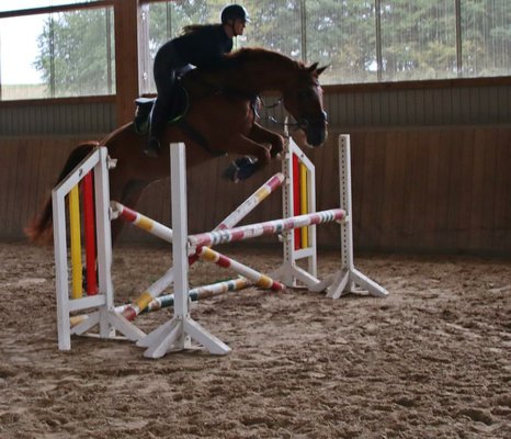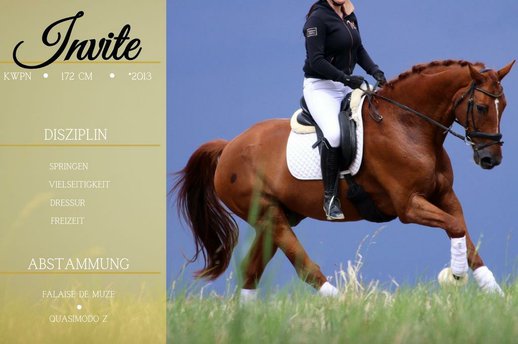 *Invite* ist ein Einladung und Freude im Umgang und beim reiten. Er geht schön in der Dressurarbeit, hat hier bereits, unter schwächeren Reitern und Jugendlichen seinen tollen Charakter bewiesen. Er ist im Springen vorgestellt und hat abstammungsgemäß natürlich genug Freude und Qualität am Sprung. Im Gelände auch total lieb. Der perfekte Allrounder, der sich auch als Lehrpferd eignet. Schick mit tollem und ausgeglichenen Charakter dazu. In fremder Umgebung zeigt er sich auch von seiner besten Seite. Longieren, Gelassenheitstraining macht er unkompliziert. Im Umgang gut erzogen und sehr einfach. Ein Traumpferd durch und durch. Er bringt aktuelle Röntgenbilder bereits mit