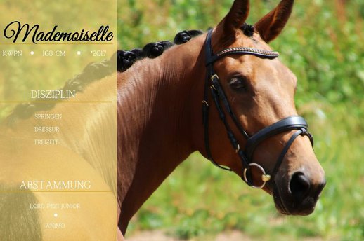 *Maddy* ist eine ganz liebe rittige und dazu wunderschöne Stute mit sehr viel Qualität. Sie zeigt sich immer lernwillig unkompliziert und macht ihrem Reiter viel Freude. Am Sprung zeigt sie eine hohe Qualität mit viel Vermögen. Sie ist cool und gar nicht Umweltorientiert auch fremde Umgebungen machen ihr nichts aus. Für Jugendliche auf solidem A - Niveau auch super geeignet. Zudem als Ausbildungspferd für den höheren Sport sehr interessant. Im Gelände auch brav. Sie liebt es zu kuscheln und ist im Umgang unkompliziert. Sie bringt eine aktuelle große AKU mit