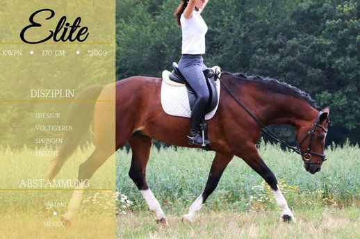 *Elite* ist ein wahr gewordener Traum. Hier stimmt einfach alles, von einer wunderschönen Optik bis zum traumhaften Charakter. Ideal für den Schulbetrieb. Von jedermann zu reiten. Sehr gut ausgebildet- für Kinder und totale Angstreiter geeignet. Dabei bringt er noch sehr gute GGA mit und ist Turniererfahren sowie platziert. Er ist nicht aus der Ruhe zu bringen, Mister cool durch und durch. Im Gelände und in fremder Umgebung total gelassen, ob alleine oder in der Gruppe. Springt auch gerne mal einen Baumstamm. Sein Video spricht Bände. !!!SCHAUEN SIE SICH UNBEDINGT SEIN VIDEO AN!!! Er gibt dem Reiter von der ersten Sekunde ein sicheres und gutes Gefühl. Gelassenheitstraining macht er toll mit. Geht am Halsring oder auch ohne Sattel - für jeden Spaß zu haben. Auch im Umgang von jedem zu händeln dabei total schmusig. Er will immer gefallen, was ihm auch gelingt. Total unerschrocken uns unbeeindruckt von der Umwelt. Warten Sie nicht zu lange, bei diesem tollen Pferd.
