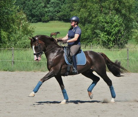 Hinzu kommt ein toller Charakter. Im Umgang ist er einfach und an Koppelhaltung gewöhnt. Im Gelände ist er ein erfahrenes und sicheres Pferd bei dem jeder Ausritt Spass macht.