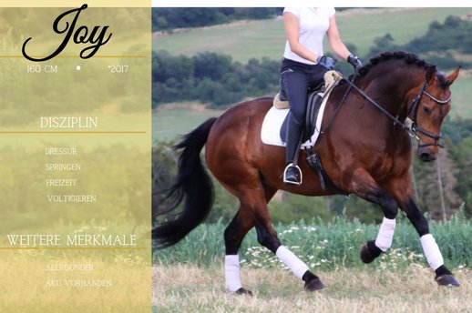 *Joy* wunderschöne und unbeschreiblich ehrliche Stute. Joy macht bei allem nur Freude. Sie geht schön in der Dressur, zeigt sich rittig mit tollem Bewegungsablauf. Seitengänge bereits angefangen. Diese tolle Stute ist dazu ganz cool und hat schon den ersten Volti Versuch perfekt gemeistert(Video auch hiervon vorhanden). Kinder können auf ihr reiten und an der Longe an die ersten Schritte problemlos ran geführt werden. Sie eignet sich sicher auch als Therapiepferd. Beim ausreiten alleine wie auch in der Gruppe, unerschrocken und einfach. Gelassenheitstraining, reiten ohne Sattel am Halfter, reiten am Halsring - mit Joy kein Problem. Sie eignet sich auch für schwache sowie Angstreiter. !!!SCHAUEN SIE SICH UNBEDINGT IHR VIDEO AN !!! Im Umgang auch lieb und verschmust, ganz aufgeschlossen und neugierig ist sie sehr Menschenbezogen. Eine AKU liegt bereits vor.