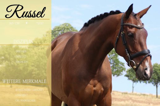 *Russel* Schicker und nervenstarker Allrounder- der sich als perfektes vielseitiges Pferd zeigt. Er hat 3 schöne GGA, springt zudem gerne und zeigt genügend Potenzial. Im Gelände geht er brav alleine und in der Gruppe, ist total unerschrocken und auch in fremde Umgebung brav. Er stand bei uns im Offenstall auf der Wiese 24/7 in gemischter Herde, dort hat er sich super intrigiert und wohlgefühlt. Zum Verkauf jetzt aufgestallt und auch in einer Box mit täglichem Ausgang zufrieden. Gelassenheitstraining macht er super mit, kennt den Trubel des Hoflebens, lässt sich brav longieren und unters Solarium stellen. Er ist im Umgang auch ein richtiger Schatz, schmust sehr gerne. Wir können uns Russel zudem für eine ambitionierte Jugendliche gut vorstellen. Weich in der Anlehnung, zeigt er genügend Potenzial bei Förderung für den Sport. Schauen Sie sich sein Video an. Russel bringt eine gute aktuelle AKU mit