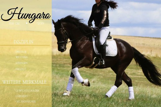 *Hungaro* wunderschöner kompakter Traum in schwarz. Hungaro ist nicht nur optisch ein Highlight, er zeigt sich dazu absolut rittig und cool. Seinem alter; weit vorraus, ist er für jedes Gelassenheitstraining zu haben. In Bahn und Gelände dazu sehr schön zu reiten und bequem zu sitzen. Einen Sprung macht er auch gerne über Baumstämme !!! SCHAUEN SIE SICH UNBEDINGT IHR VIDEO AN !!! Ob Straßenverkehr, Planen, Fahnen, Seifenblasen, landwirtschaftliche Geräte, er bleibt gelassen. Im Gelände auch alleine super artig und neugierig. Im Umgang sowas von verschmust und Menschenbezogen, dazu gut erzogen. Ein ehrlicher Kerl der auch für schwache Reiter / Jugendliche geeignet ist. Er hat eine aktuelle große AKU dabei.