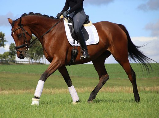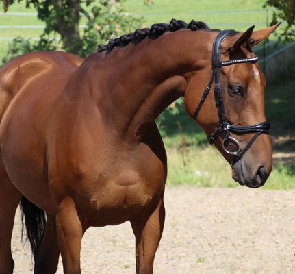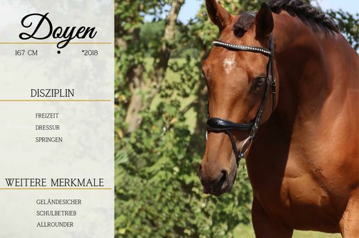 *Doyen* Diese bezaubernde und wunderschöne Stute überzeugt mit ihrer Schönheit und ihrer tollen Arbeitseinstellung sowie mit Nervenstärke. Sie zeigt sich altersentsprechend schön zu reiten in der Bahn im Gelände ist sie stets cool und zuverlässig. Sie hat auch schon einen kleinen Sprung gemacht, mit weiterer Förderung hat sie auch sicher hier Freude.