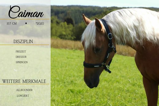 Wenn Sie auf der Suche nach einem Pferd sind, das nicht nur Ihr Herz berührt, sondern auch Ihre Reitträume wahr werden lässt, dann ist Caiman die Antwort. Verpassen Sie nicht die Chance, diesen außergewöhnlichen Begleiter in Ihr Leben zu holen. Caiman freut sich darauf, sein neues Zuhause bei einem liebenden Reiter zu finden.