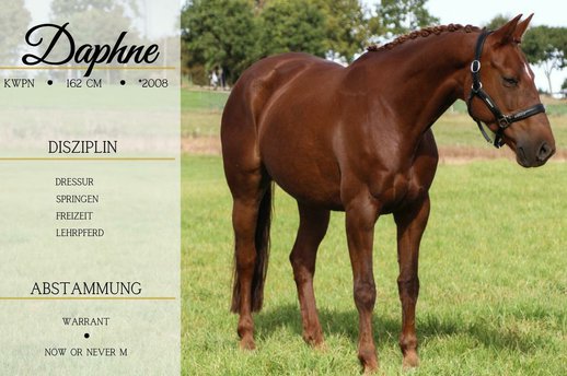 Daphne ist eine 2008 geborene, ca. 162 Stute, v. Warrant, Numero Uno, Nimmerdor