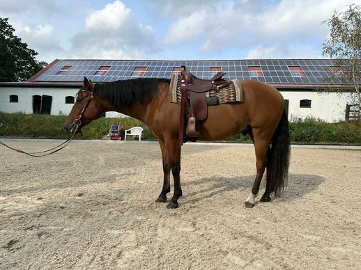 Dieser bildhübsche Quarter Horse Wallach sucht einen Partner, der sich am liebsten täglich mit ihm beschäftigt und ihn lieb hat und dem das Reiten nicht so wichtig ist. Mr Lova Lova ist ein 2013 geborener, 167 cm großer Wallach mit vollen Papieren. Er besitzt einen lieben Charakter, ist immer motiviert und wird gerne gearbeitet. Er kennt tagsüber Weide und nachts Box. Im Sommer braucht er eine Ekzemerdecke, da er allergisch auf Gnitzen reagiert. Mr Lova Lova wird als bedingt reitbarer Beisteller abgegeben, da er aufgrund eines Befundes immer wieder mal lahmt. Unterm Sattel bringt der Wallach einfach nur Spaß und trägt auch problemlos Anfänger durch die Halle und das Gelände. Im Gelände ist er immer gechilled und zuverlässig. Für Kinder ist er jedoch nicht geeignet. Er wird aufgrund von absolutem Zeitmangel nur in allerbeste Hände abgegeben.