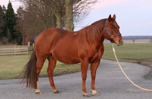 Aus persönlichen Gründen wird für diese bildhübsche, ausdrucksstarke Quarter Horse Stute ein neues Zuhause gesucht. Montana ist 2009 geboren mit einem Stockmaß von ca. 151 cm. Die Stute steht noch in dem alten Schlag, Viel Pferd mit ausgeprägter Muskulatur und kräftigen Beinen und guten Hufen. Sie ist vom Charakter eher introvertiert und braucht ein wenig Überzeugungsarbeit in der Zusammenarbeit mit dem Menschen. Montana ist brav im Umgang und schmiede- und verladefromm. In ihrem bisherigen Leben brauchte sie nicht viel tun unterm Sattel. Wurde gebisslos viel ins Gelände geritten und hatte auch schon Kontakt zu Rindern. Die Stute hatte bisher 2 ganz tolle Fohlen und ist auch wieder tragend für 5.2024 von CL Scotch Bar Shine. Ist eine fürsorgliche Mutter und ihre Geburten waren problemlos. Aufgrund ihrer tollen Abstammung (ihr Vater ist der DQHA Elitehengst CL Silent Badger und mütterlicherseits hat Montana noch Zan Parr Bars auf dem Papier) und ihrem Körperbau ist sie sehr interessant für die Zucht. Ideale Stute für Liebhaber von Quarter Horses vom alten Schlag und für jemanden, der mit Geduld sie weiter ausbildet kann. Wird nur in ein liebevolles Zuhause abgegeben.