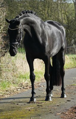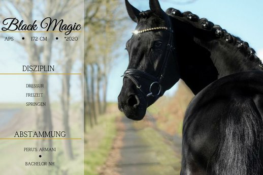 Black Magic ist eine 4 Jährige Stute ca. 1,72 cm v. Peru´s Armani, Sir Donnerhall, Sandro Hit x Bachelor, Burggraaf