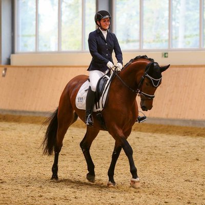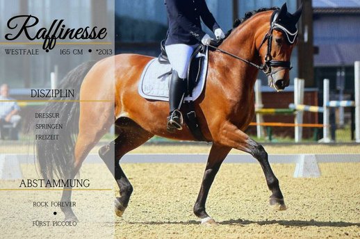 *Raffinesse* ist ein super ausgebildetes Lehrpferd in wunderschöner Optik. Sie ist sehr lektionssicher und hat Platzierungen bis zur Klasse L in der Dressur. Leicht durchs Genick zu reiten, kennt aber zudem Ausbinder. Im Springen bis E- Parcour zuhause gesprungen, dort zeigt sie auch viel Freude dran. Beim Ausreiten auch völlig problemlos und cool, wurde mit ihr regelmäßig gemacht. Raffinesse ist auch super als Mutter / Kind Pferd aufgrund ihrer schönen Größe geeignet. Weder heiß noch triebig, einfach rittig. Ein traumhafte Allrounderin die alles mitmacht. Leicht zu verladen, brav auf dem Turnier sowie überhaupt nicht guckig. Straßenverkehr, Lärm und auch fremde Umgebungen, machen ihr nichts aus. Im Umgang völlig unkompliziert dazu. Die Besitzerin hat die Stute 4 Jährig vom Züchter gekauft, sie war nie krank. Aufgrund von Schwangerschaft in liebevolle Hände zu verkaufen. Ein passender neuwertiger Sattel ( erst 1 Jahr alt), der super auf sie passt, kann sehr gerne dazu erworben werden.