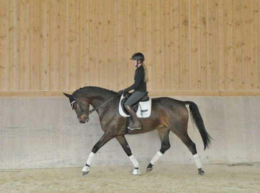 Schicker, auffälliger Sohn des D’Egalite in begehrter dunkler Jacke mit drei guten GGA und ehrlichem Charakter. Sehr rittig und einfach durchs Genick. Auch das Gelände kennt er sowie kleine Sprünge unter dem Sattel, er meister seine täglichen Anforderungen unter dem Sattel hervorragend.