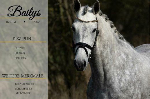 *Bailys* Schöner kann man ein Pferd nicht malen, dazu mit Rittigkeit, Qualität und super Nerven ausgestattet. Sie bringt 3 sehr gute und bequeme GGA mit sich, bietet sich leicht im Genick an und macht nur Freude. Sie ist so unerschrocken, auf ihr rumturnen, Planen, Lärm usw. lassen sie unbeeindruckt. !!!SCHAUEN SIE SICH UNBEDINGT IHR VIDEO AN!!! Sie ist somit auch als Allrounderin gut an. Sie eignet sich für Jugendliche und auch ängstliche Reiter mit Begleitung, trotz ihres alters. Auf ihr fühlt man sich so sicher. Man kann sich nur in dieses bezaubernde Pferd, wo einfach alles stimmt, verlieben. Sie wird jeden so schnell begeistern wie auch uns. Sie bringt eine aktuelle große AKU mit.