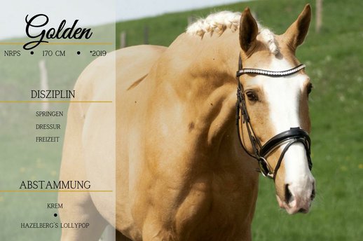 Golden ist ein 2019 geborener NRPS Wallach ca. 1,70 v. Krém, Robin Hood x Jeweel, Come on, Grosso Z