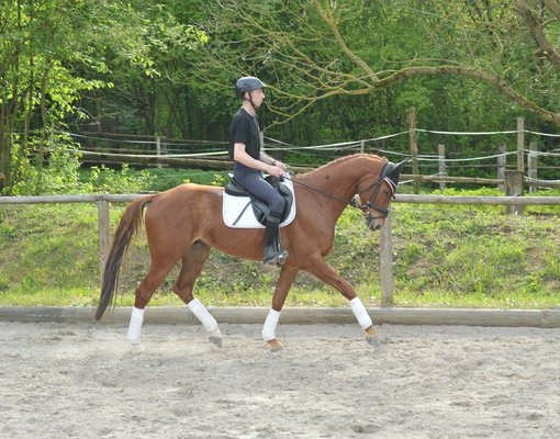 Sehr netter, ansprechender Fuchswallach mit drei guten GGA. Bereits mit Turniererfahrung in den Klassen A- und L-Springen. Mit tollem Charakter. Auch im Umgang brav und unkompliziert. Auch dressurmäßig sehr gut zu reiten. Kennt auch Gelände. Ein toller Wallach für den vielseitigen Einsatz, für Dressur, Springen und Freizeit.