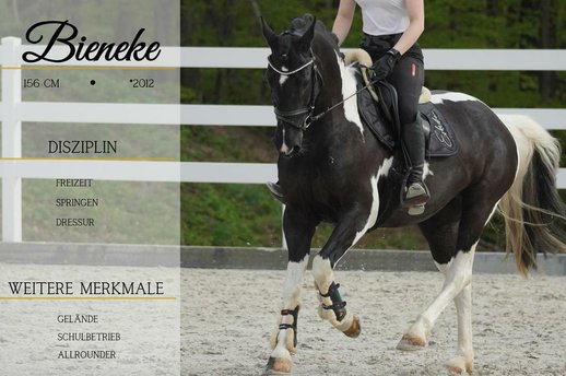 *Bieneke* ist eine wunderschöne Stute mit viel Ausdruck und Ausstrahlung, dazu mit einem super Charakter ausgestattet. Mit Bieneke kann man alles machen. Sie geht in der Bahn, springt mit Freude und ist brav bei Ausritten. Man kann sie ohne Sattel reiten, Baumstämme springen und jeden Spaß mit ihr machen, sicher auch für Working Equitation zu haben. Auf ihr fühlt man sich sicher. Sie hat ein angenehmes go und ist leicht zu händeln, daher auch für Jugendliche und schwächere Reiter geeignet. !!!SCHAUEN SIE SICH UNBEDINGT IHR VIDEO AN!!! Sie ist im Umgang total lieb und gut erzogen, genießt Streicheleinheiten. Ein Traumhaftes Kleinpferd, welches nur Freude bereitet. Sie bringt eine aktuelle große AKU bereits mit.