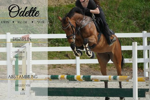 *Odette* ist bildschön und zeigt sich als tolle Allrounderin. Sie konnte sich bereits im Springen platzieren und zeigt eine sehr gute Qualität. Die Stute muss altersgerecht natürlich weiter gefördert werden und sucht somit einen Reiter ab A Niveau auch super für Jugendliche vorstellbar. Zudem bringt Odette 3 sehr gute GGA mit sich und kann dazu im Viereck glänzen. Sie ist immer willig zu lernen und reagiert jetzt schon super fein auf kleine Hilfen. Wir können sie uns auch im Vielseitigkeitssport vorstellen. Sie ist für jeden Spaß zu haben und somit die perfekte Allrounderin die dazu eine hohe Qualität mit bringt. !!!SCHAUEN SIE SICH UNBEDNGT IHR VIDEO AN !!! Bringt eine große aktuelle AKU mit.