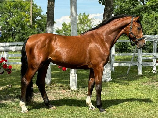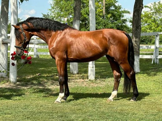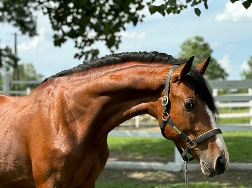 Ein dreieinhalb Jahre alter Hengst mit hochwertiger Genetik und Fähigkeiten sucht einen neuen Sportpartner.