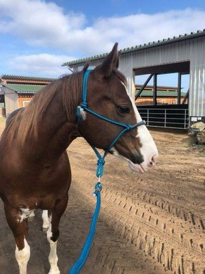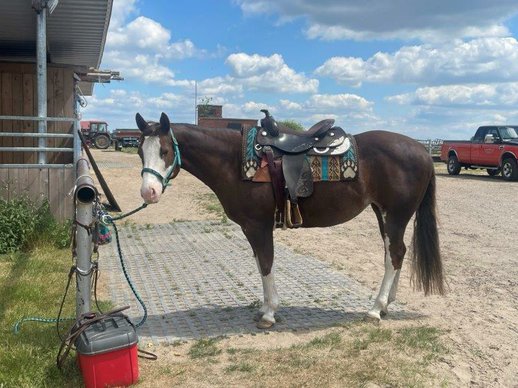 Sehr schweren Herzens sucht diese wundervolle Paint Horse Stute ein neues Zuhause, da der Fokus eher auf das Turnierreiten gelegt wird. Katy ist 2016 geboren und hat ein geschätztes Stockmaß von 145 cm. Diese Stute ist einfach nur ein Traumpferd- sehr liebenswert, kinderlieb, besitzt einen absolut lieben Charakter, macht alles mit und will immer nur gefallen. Ideal als Familienpferd für Groß und Klein. Die Stute besitzt eine Westerngrundausbildung (LK3) und geht super ins Gelände. Alleine und in der Gruppe. Ist sehr brav unterm Sattel und daher auch für Kinder und schwache Reiter geeignet. Sollte regelmäßig bewegt werden um ausreichend Muskulatur zu behalten. Sie wird als Freizeitbegleiter abgegeben wegen einer Hangbeinlahmheit aufgrund eines Beckenbruchs in jungen Jahren. Diese wird weniger, wenn sie regelmäßig gearbeitet wird. Auch wäre sie als Zuchtstute interessant. Sie ist eine Wimpys Little Step Enkelin. Mütterlicherseits ist sie Really Rugged Kid gezogen. Auf Wunsch kann ein passender Sattel mit erworben werden.