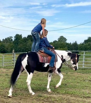 "Stormy" ist ein auffälliger 11 Jahre alter schwarz-weiß lackierter Wallach. Er ist stämmig und steht 15 Hände. Er ist so vielseitig wie es nur geht, egal ob Sie ein Wettkampfpferd, ein erfahrenes Wanderpferd oder einfach nur ein sicheres Pferd suchen, das die ganze Familie genießen kann!