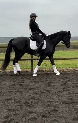 Ausbildung: Solide Grundausbildung, bereit für die Dressurprüfung der Klasse S. Auch bereit für Springpferd S (1,40 m) im Springreiten. Ein absolut talentierter schwarzer Wallach mit viel positiver Energie, Flexibilität, Selbstvertrauen und viel Potenzial als ideales Allroundpferd.