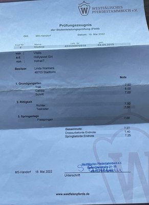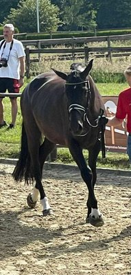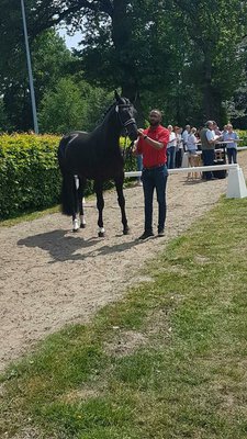 Zum Verkauf steht eine beeindruckende Rappstute. Die Ausbildung des Pferdes wurde auf Dressurschwerpunkt gelegt. Die Stute ist dreijährig und angeritten. Sie hat die Stutenleistungsprüfung erfolgreich absolviert. Nach der Leistungsprüfung hat sie ein tolles Fohlen bekommen. Die elegante Stute überzeugt nicht nur durch ihre imposannte und raumgreifenden Erscheinung sowie Bewegungen, sondern auch durch ihren ausgeblichen Charackter und gute Rittigkeit. Sie bringt drei Grundgangarten mit und eignet sich ideal für den gehobenen Dressursport oder die Zucht. Aktuell ist sie nicht beritten. Die Stute ist als Verbandprämienstute mit einer Goldmedaille eingetragen.