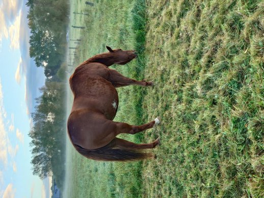 Hier wird eine Quarter Stute angeboten sie ist 9 Jahre alt hat ein Stut Fohlen bei sich was ebenfalls erworben werden kann auf Grund der Diagnose Kissing spines wird sie nicht als Reitpferd abgeben Boden arbeiten, Spazieren gehen macht sie gerne mit für Kinder zum Putzen oder nur Beisteller zu empfehlen. Im täglichen Umgang ist sie freundlich und aufgeschlossen gut Halfter führig sie lernt sehr schnell die Zähne sind 25 gemacht Wurmkur, Impfungen sowie Hufschmied sind selbst verständlich. Gesundheitlich sind keine weiteren Mängel bekannt sie hatte noch nie eine OP sie hat keine Unarten sie schlägt nicht sie muß auch beim Putzen nicht angebunden werden sie genießt lieber. Sie ist eingetragen als Zuchtstute mit 5 Panel Test in n/n sie ist noch keine alte Oma und wird sicher noch viel Freude bereiten wir werden aus Altersgründen die Pferde Haltung aufgeben.