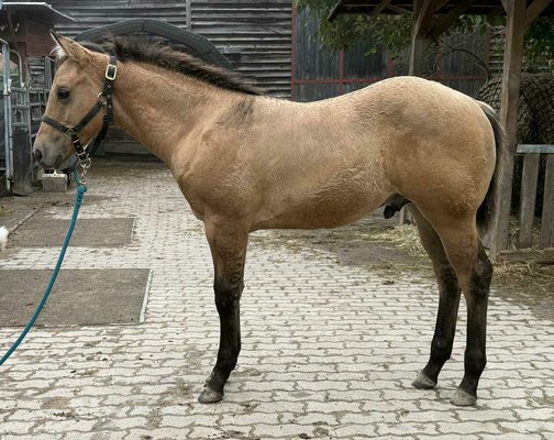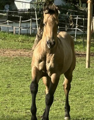Roosters Bexx On Ice - bildhübscher dunskin Quarter Horse Hengst (5.25 geboren, voraussichtliches Endmaß ca. 150 cm) bringt alles mit, was man sich von einem Nachwuchspferd wünscht: Ein korrekter, kompakter und kräftiger Körperbau, eine gute Bemuskelung und ein gesundes Fundament machen es zu einem echten Allround-Talent mit Zukunft. Der kleine Charmeur wächst artgerecht im Herdenverband mit anderen Jungpferden auf und wird täglich liebevoll gehändelt. Bexx zeigt sich durchweg menschenbezogen, verschmust, brav und unkompliziert - einfach ein Schatz im täglichen Umgang. Er liebt seine Kuscheleinheiten und bleibt dabei stets cool und freundlich. Bei Abgabe: geimpft, regelmäßig entwurmt, kennt Tierarzt & Hufschmied. Toller Beweger - ideal für Freizeit und mehr. Ein Nachwuchspferd mit viel Herz, Qualität und Potenzial - ideal für Menschen, die einen unkomplizierten, talentierten Partner fürs Leben suchen.