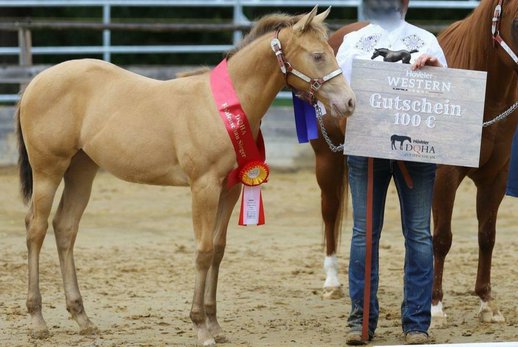 Lady In Champagne - eine außergewöhnlich hübsche Quarter Horse Stute in der seltenen Farbe Amber Champagne, geboren am 08. April 2025. Mit einem geschätzten Endmaß von ca. 150 cm, ihrem korrekten, kompakten Gebäude, der tollen Bemuskelung und ihrem liebevollen Ausdruck ist sie ein echter Eyecatcher - sowohl optisch als auch charakterlich. Als 1a-Prämienfohlen und mit einem 6. Platz beim DQHA Fohlenchampionat 2025 bringt sie bereits jetzt beste Voraussetzungen für eine erfolgreiche Zukunft mit. Sie stammt aus einer hervorragenden Allround-Linie, die viele Möglichkeiten offenlässt - egal ob Sport, Turnier oder Freizeit. Lady In Champagne wächst im Herdenverband auf großzügigen Koppeln auf und zeigt sich dort ausgeglichen, neugierig und sehr menschenbezogen. Sie ist verschmust, cool im Kopf, bewegungsfreudig und lernt schnell. Ihr aufgewecktes Temperament ist dabei stets angenehm und ausgeglichen - ein echtes Goldstück mit klarem Köpfchen. Sie kennt Hufschmied und Tierarzt, wird täglich gehändelt und ist halfterführig. Anhängerfahren, Hufegeben, Putzen sowie das Mitlaufen als Handpferd im Gelände sind für sie bereits vertraut. Lady In Champagne ist gesund, regelmäßig entwurmt, bei Abgabe altersgerecht geimpft und genetisch frei (5-Panel und MHYM n/n). Der Farbtest liegt ebenfalls vor. Ob als späterer Freizeitpartner oder sportlicher Allrounder - diese junge Stute vereint Charme, Qualität und eine auffällige Farbe zu einem rundum gelungenen Gesamtpaket. Sie wird mit vollständigen AQHA-Papieren und Equidenpass in fördernde Hände abgegeben. Ein bezaubernder Youngster mit viel Potenzial - bereit, Herzen zu erobern.