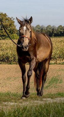 Miss Sinny Bar ist eine im Juni 2021 geborene buckskinfarbene Quarter Horse Stute mit einem Stockmaß von etwa 150 cm. Sie ist elegant, sportlich gebaut und gehört nicht zu den Gewichtsträgern, überzeugt aber durch ihre harmonische Entwicklung und ihre natürliche Athletik. Trotz eines angebrochenen Dornfortsatzes im Alter von zwei Jahren, der laut Tierarzt vollständig ausgeheilt ist, ist sie heute gesund, voll belastbar und wird regelmäßig geritten. Gerne kann der Tierarzt dazu befragt werden. Sie ist 5-Panel n/n über die Eltern, regelmäßig geimpft, entwurmt und zahnärztlich kontrolliert, läuft barhuf und war stets unter professioneller Sattelkontrolle. Aktuell lebt sie im Offenstall mit 24-Stunden-Heuversorgung und Weidegang und zeigt sich dort ranghoch innerhalb der Herde. Im Umgang ist sie ein sehr liebes, menschenbezogenes und verschmustes Pferd, das gleichzeitig willensstark, neugierig und manchmal etwas ungeduldig ist. Sie möchte immer gefallen, lernt schnell und zeigt viel Eifer sowie Offenheit für neue Aufgaben. Da sie noch viel hinterfragt und eine klare, faire Führung braucht, ist sie kein Anfängerpferd. Miss Sinny Bar wurde schonend und vielseitig nach dem Pro-Ride-Konzept ausgebildet. In der Halle läuft sie sicher in Schritt, Trab und Galopp und geht sowohl alleine als auch in der Gruppe zuverlässig ins Gelände. Besonders in der Freiarbeit sowie in der Boden- und Longenarbeit zeigt sie großes Talent. Durch ihre sehr gute Reining-Abstammung (Einsteins Revolution x Bueno Swiss Doc) ist sie nicht nur als Nachwuchspferd für ambitionierte Freizeitreiter interessant, sondern perspektivisch auch für die Zucht. Der passende Sattel kann auf Wunsch mit erworben werden. Da es sich um keinen Notverkauf handelt, wird großer Wert auf ein geeignetes Zuhause gelegt, in dem diese talentierte Stute weiter gefördert und abwechslungsreich beschäftigt wird. Miss Sinny Bar bringt alles mit, was man sich von einem jungen, motivierten Pferd wünscht, das gemeinsam mit seinem Menschen wachsen möchte.