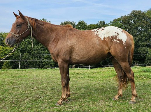 Zum Verkauf steht der bildhübsche Appaloosa-Wallach Waps Rolex, direkt vom Züchter, mit hervorragendem Charakter und viel Potenzial für Sport und Freizeit. Appaloosa Wallach, geb. 03.09.2021, ca. 160 cm, Farbe: liver chestnut with blanket. Er überzeugt durch ein korrektes, harmonisches Gebäude, ein solides Fundament mit starken Knochen und guten Hufen, läuft barhuf und ist ausgewogen bemuskelt. Seine weichen und angenehmen Grundgangarten machen das Reiten besonders komfortabel. Waps Rolex ist sehr menschenbezogen, ruhig und brav im Umgang, dabei verspielt und stets interessiert an dem, was sein Besitzer macht. Er möchte immer gefallen, lernt schnell und bringt ein ausgeglichenes, angenehmes Temperament mit. Er wuchs im Herdenverband auf, ist dort mittelrangig und sozial gut integriert. Verladen ist für ihn kein Problem, Tierarzt und Hufschmied kennt er selbstverständlich. Der Wallach besitzt eine gute Westernausbildung und wird aktuell vom Profi weiter in Richtung Ranch Riding gefördert. Die meiste Zeit seiner Ausbildung verbrachte er im Gelände und kennt das Reiten an unterschiedlichen Orten wie z.B. Strand. Unter dem Sattel zeigt er sich sehr zuverlässig, mit Talent insbesondere für Ranch-Klassen, ist aber ebenso als vielseitiger Freizeitpartner geeignet. Gesund, regelmäßig geimpft und entwurmt, dem Zahnarzt regelmäßig vorgestellt und 5-Panel n/n. Die ApHC-Papiere liegen vor. Ob als zukünftiges Showpferd oder als zuverlässiger Freizeitpartner - mit seinem goldenen Charakter und seiner guten Abstammung ist dieser Youngster ein echtes Versprechen für die Zukunft.