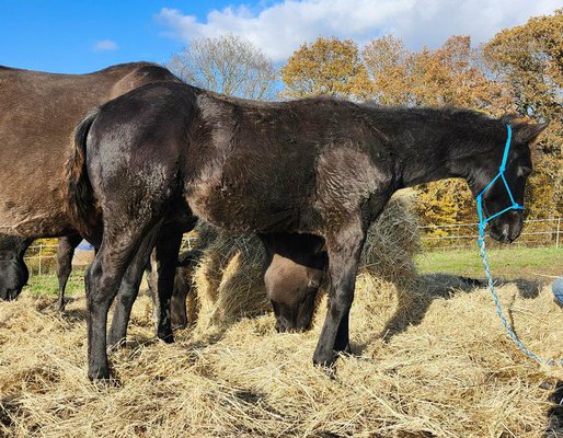Drifts To The Future ist ein bildhübscher American Quarter Horse Hengstjährling, geboren am 05.06.2025. Er ist schwarz (black) mit nur wenigen Stichelhaaren an der Stirn und genetisch homozygot black sowie homozygot agouti. Die AQHA-Papiere sind beantragt, das zu erwartende Endmaß liegt bei ca. 162 cm. Der junge Hengst überzeugt durch ein korrektes Gebäude, eine sehr gute Entwicklung, ausgewogene Bemuskelung und starke Knochen. Midnight wird später auch größere Reiter problemlos abdecken können. Seine Grundgangarten sind gut und taktsicher, er lernt schnell und bringt ein ausgeglichenes, angenehmes Temperament mit. Charakterlich ist Midnight ein echtes Goldstück. Er ist sehr menschenbezogen, stets freundlich, ruhig und gelassen und meist der Erste, der einen am Weidetor begrüßt. Er möchte gefallen, ist sehr brav im Umgang und zeigt sich jederzeit kooperativ. Er wächst im Herdenverband auf, kennt das Fohlen-1x1, ist halfterführig und kennt sowohl Tierarzt als auch Hufschmied. Er ist gesund,regelmäßig entwurmt und 6-Panel n/n getestet. Abstammungsmäßig ist er etwas ganz Besonderes: Er ist der einzige Sohn von Drifts Chip in Europa und stammt aus der berühmten 6666 Ranch-Blutlinie, die weltweit für Vielseitigkeit, Leistungsbereitschaft und Rittigkeit bekannt ist. Damit ist er nicht nur für Freizeit und Turniersport, sondern auch für die Zucht hochinteressant. Ob als zukünftiges Showpferd, Sportpartner oder zuverlässiger Freizeitbegleiter - mit seinem Potenzial für verschiedene Disziplinen und seinem außergewöhnlich lieben Charakter ist Drifts To The Future ein echtes Versprechen für die Zukunft.