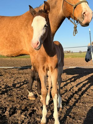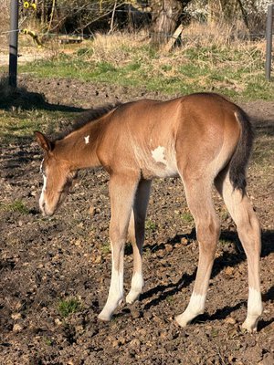 Hes A Diamond Chex ist ein hochwertiges Paint Horse Hengstfohlen, geboren am 29.03.2026, in der außergewöhnlichen Farbgebung bay dun overo splash (Farbtest läuft). Mit einem zu erwartenden Endmaß von ca. 153 cm präsentiert er sich als kompakter, korrekt gebauter und vielversprechender Nachwuchshengst mit guten Proportionen und viel Ausdruck. Dieses Hengstfohlen überzeugt nicht nur optisch als absoluter Eyecatcher, sondern auch durch seine natürliche Präsenz und seine lockere, elastische Bewegungsqualität. Durch seine interessante Abstammung eignet er sich besonders für den Reining- und Allroundbereich, ist ebenso für den ambitionierten Freizeit- oder Turnierreiter eine spannende Perspektive. Charakterlich zeigt er sich außergewöhnlich menschenbezogen, freundlich und unkompliziert. Er ist neugierig, clever und gleichzeitig gelassen in neuen Situationen. Typisch Fohlen bringt er eine fröhliche, leicht freche Art mit, bleibt dabei aber stets cool und nervenstark. Umweltreize wie Landmaschinen, Autos und alltägliche Geräusche kennt er bereits und nimmt diese völlig entspannt an. Hes A Diamond Chex wächst artgerecht im Herdenverband mit anderen Fohlen auf und wird hochwertig aufgezogen. Er erhält altersgerechtes Aufzuchtsfutter, ist regelmäßig entwurmt und gesundheitlich unauffällig. Der aktuelle 5-Panel-Test ist n/n. Im täglichen Umgang wird er konsequent, aber liebevoll gehändelt. Er kennt bereits den Tierarzt sowie den Hufschmied und wird ans Halfter gewöhnt. Das Fohlen-ABC wird kontinuierlich gefestigt. Zusätzlich kennt er das Verladen und fährt problemlos im Anhänger. Auch erste Ausflüge ins Gelände gehören bereits zu seiner Entwicklung. Dieses Paint Horse Hengstfohlen bringt beste Voraussetzungen für eine Zukunft im Sport sowie im gehobenen Freizeitbereich mit. Durch seinen Charakter, seine Nervenstärke und seine natürliche Coolness ist er sowohl für ambitionierte Turnierreiter als auch für Freizeit- und Familienpferdehalter interessant.