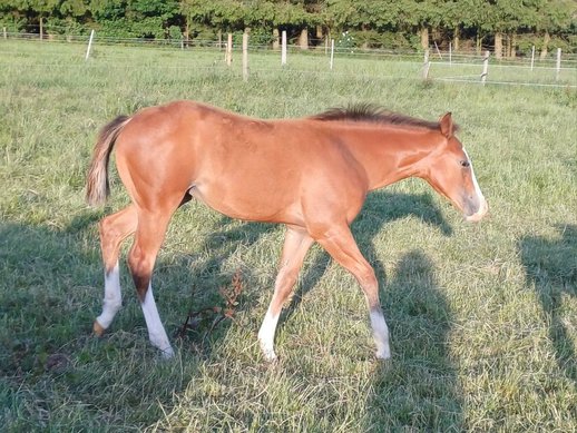 UG What A Cody Gun - eine bildhübsche Quarter Horse Stute mit auffälliger Zeichnung in der besonderen Farbe bay splash, geboren am 18.März 2025. Mit einem geschätzten Endmaß von etwa 150 bis 152 cm wird sie nicht nur groß und kräftig, sondern bringt auch jetzt schon einen korrekt gebauten, kompakten und stabilen Körperbau mit, der auf eine vielversprechende sportliche Zukunft schließen lässt. Sie wächst artgerecht in gemischter Jungpferdegesellschaft mit anderen Fohlen und Jährlingen auf und darf sich unter besten Bedingungen in Ruhe entwickeln. Gesundheitlich ist sie top versorgt, regelmäßig entwurmt, altersgemäß geimpft und genetisch über die Eltern 5-Panel n/n. Charakterlich zeigt sich diese junge Dame von ihrer besten Seite: freundlich, aufgeschlossen, menschenbezogen und neugierig. Sie ist zutraulich, aufmerksam, lernt schnell und gibt sich im täglichen Umgang bereits jetzt artig, brav und unkompliziert. Das Fohlen-1x1 sitzt - sie kennt Halfter, lässt sich führen und zeigt sich stets kooperativ. Dank ihrer hervorragenden Reining- und Allroundabstammung bringt UG What A Cody Gun ideale Voraussetzungen für eine Karriere im Turniersport mit, ist aber ebenso eine interessante Nachwuchsstute für den vielseitigen Freizeiteinsatz. Ein vielversprechendes Jungpferd mit tollem Charakter, starker Optik und besten Anlagen für die Zukunft.