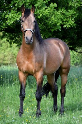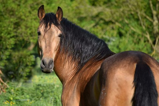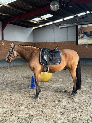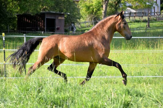 Wunderschöner PRE-Wallach, geb. 2.2021, in der seltenen Farbe Buckskin/Falbe. Er ist sehr barock gebaut, extrem kompakt und besitzt ein korrektes Gebäude. Im Sommer glänzt sein Fell goldfarben - ein echter Blickfang. Mit einem Stockmaß von ca. 160 cm deckt er seinen Reiter hervorragend ab und überzeugt mit bildhübscher Erscheinung. Der Wallach ist regelmäßig entwurmt und geimpft und kennt Boxenhaltung mit Paddock. Charakterlich ist er ein absoluter Schatz: menschenbezogen, verschmust, verspielt, freundlich, artig, unerschrocken, neugierig, aufgeschlossen und sehr anhänglich. Unter dem Sattel ist er mega bequem zu sitzen, zeigt schöne Grundgangarten und arbeitet stets motiviert und lernwillig mit. Er besitzt eine solide Basisausbildung: Er geht alle Grundgangarten, beherrscht Seitengänge und Rückwärtsrichten. Am Boden zeigt er ebenfalls viel Talent - Kompliment und spanischer Schritt sind abrufbar. Bodenarbeit ist ihm bestens vertraut. Ein traumhaft schönes, talentiertes Pferd für einen motivierten Reiter, der Freude daran hat, gemeinsam weiterzuarbeiten und ihn zu fördern.