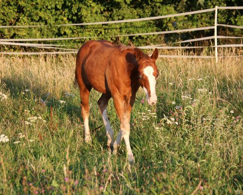 BE Diamonds Gunshine - dieser Eyecatcher, 4.25 geboren mit einem geschätzten Endmaß von 148 -153 cm, beeindruckt nicht nur mit seiner tollen Zeichnung, sondern auch mit seinem Charakter, seinem Körperbau und seiner Abstammung. Grays Starlight, Shining Spark, Peppy San Badger und Lil Ruf Peppy, diese erfolgreichen QH Hengste der Reining Zucht findet man in seinem Papier. Diamonds Vater, Walla Walla Gunshine, wurde sehr erfolgreich geshowt (LTE: 20.000 $). Der Jährling besitzt einen verschmusten, coolen Charakter. Ist sportlich unterwegs und weiß sich zu bewegen. Der Hengst ist harmonisch gebaut mit ausgewogener Bemuskelung und korrektem Körperbau. Er hat ein blaues und ein braunes Auge. Diamond wächst artgerecht mit gleichaltrigen Jungpferden auf und kennt das Fohlen ABC. Top Nachwuchspferd mit einem Charakter aus Gold.