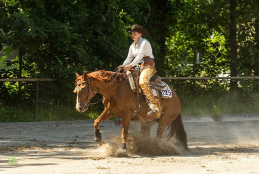 GNR Rooster Cielos, geboren im April 2017, ist ein bildhübscher Quarter Horse Wallach in der Farbe Sorrel mit einem Stockmaß von ca. 150 cm. Er ist korrekt gebaut, kompakt und überzeugt durch seine erstklassige Reining-Abstammung sowie seine solide Ausbildung. Cielo verfügt über einen ausgesprochen freundlichen und menschenbezogenen Charakter. Herdenverträglich, sozial und unkompliziert, zeigt er sich sowohl in gemischten Herden als auch in Box mit Paddock oder auf der Weide äußerst verträglich. Im Umgang ist er sehr lieb, ruhig, umgänglich und hat keine Unarten. Der Wallach ist beschlagen, regelmäßig geimpft und entwurmt. Unter dem Sattel ist GNR Rooster Cielos bequem zu sitzen, lernwillig und talentiert. Reining-Manöver wie Stop, Spin und Rollback beherrscht er sicher, der fliegende Galoppwechsel wird bereits geübt. Im Gelände ist er jederzeit ruhig und zuverlässig, erste Erfahrungen am Rind hat er ebenfalls brav gemeistert. Auf Turnieren wurde Cielo bereits erfolgreich platziert. Gelegentlich zeigt er im Galopp leichte Sensibilität bei zu viel Druck, reagiert dann mit einigen schnelleren Vorwärtsschritten, bleibt jedoch jederzeit kontrollierbar und geht nicht durch. Aufgrund dessen ist der Wallach kein Anfängerpferd, sondern ideal für erfahrene Reiter, die seine Talente gezielt fördern möchten. GNR Rooster Cielos befand sich zwei Jahre im professionellen Beritt und ist bestens ausgebildet. Leider wurde er in den letzten Monaten aufgrund von Zeitmangel wenig geritten und müsste wieder antrainiert werden. Ein leichter Spat hinten links ist vorhanden; Röntgenbilder können auf Wunsch angefordert werden. Er läuft sich nach kurzer Zeit ein. Für einen engagierten Reiter, der sich nicht von dieser Diagnose abschrecken lässt, ist er ein absolutes Highlight mit Potenzial.