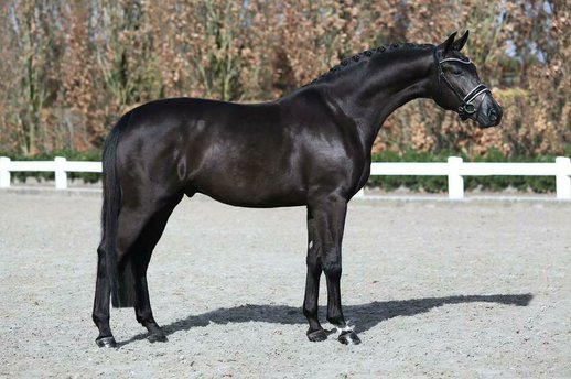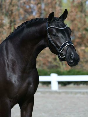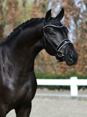 Sein tiefschwarzes, glänzendes Fell unterstreicht seine edle Erscheinung. Der ausdrucksstarke Kopf mit wachem, intelligentem Auge sowie der gut aufgesetzte, schön gewölbte Hals verleihen ihm eine natürliche Aufrichtung und Präsenz. Er überzeugt mit drei überdurchschnittlichen Grundgangarten: Der Schritt ist taktsicher und raumgreifend, der Trab elastisch mit hervorragender Schwebephase, und der Galopp bergauf, ausbalanciert und mühelos regulierbar – beste Voraussetzungen für den gehobenen Dressursport.